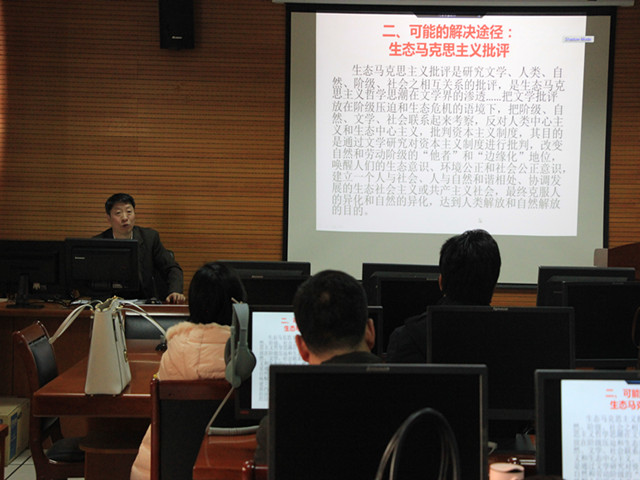 首先,陈茂林教授提出当前生态批评存在的问题,并进行了深刻的剖析。陈教授指出,第一阶段生态批评对生态危机原因——人类中心主义缺乏辨析,其思想基础——生态整体主义淡化了生态批评的人学品格。对这些问题的质疑和环境公正运动一起促成了第二阶段生态批评——生态女性主义批评和后殖民生态批评的诞生。但两种批评仍主要属于文化批判,欠缺现实性和实践性,对人类利益重视不够,对解决危机方案的探讨尚不彻底,因而暴露出乌托邦色彩。接着,陈教授针对存在的问题提出了解决对策。马克思主义生态批评以其人本自然观,对生态危机根源进行批判,提出解决危机的途径,超越了生态女性主义批评和后殖民生态批评,实现了批评实践中自然生态和人类社会的融合,提升了生态批评的人学品格,为生态批评开辟了广阔的学术空间。最后,陈教授和在座教师针对论文发表及项目申报进行了经验交流,强调发表高层次论文、申报高层次项目选题问题意识及深度对话意识的重要性,要坚持洋为中用、古为今用、推陈出新的学术态度。