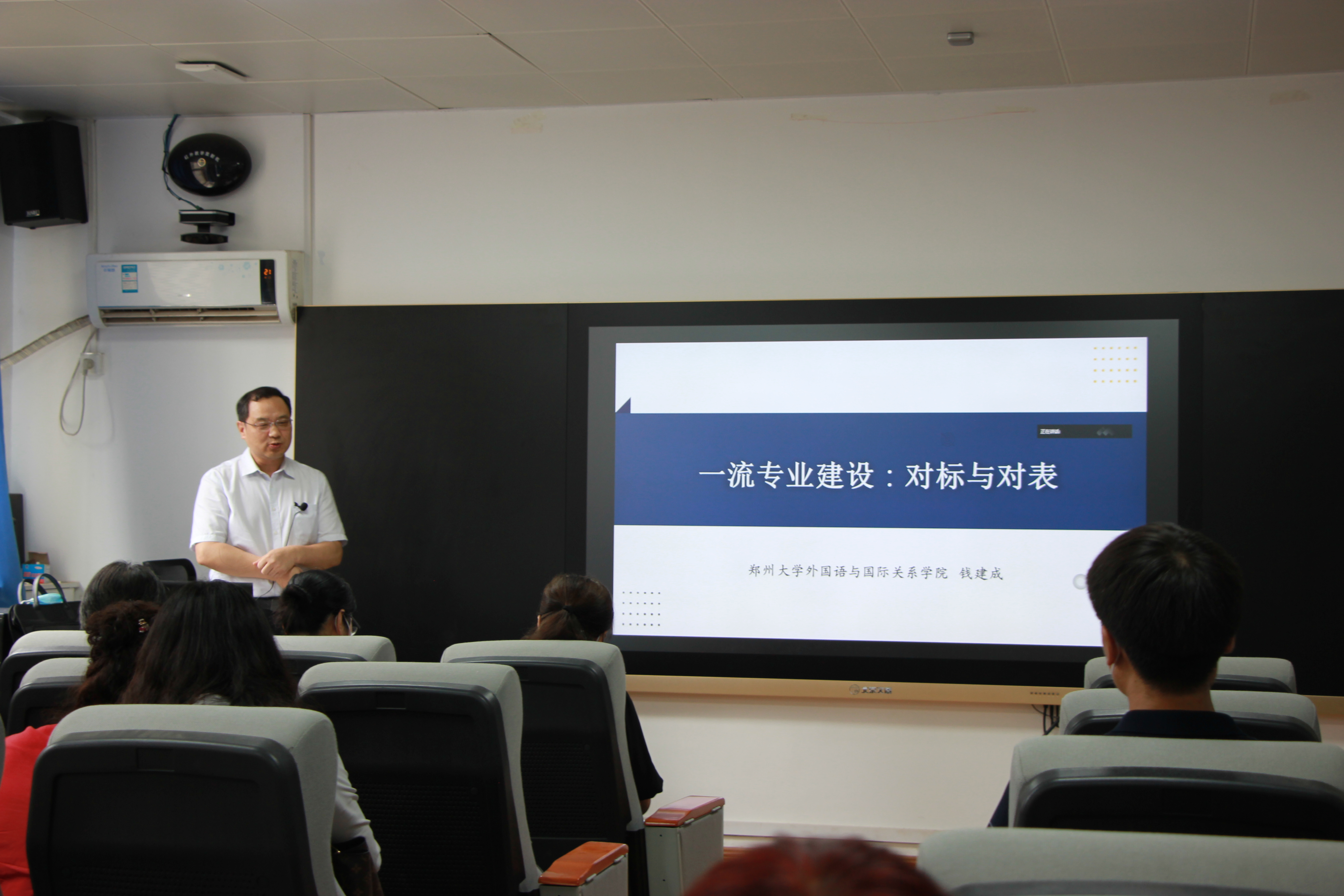 会上,体育吧 特别邀请郑州大学外国语与国际关系体育吧 院长、博士生导师钱建成教授做了题为“一流专业建设:对标与对表”的学术报告。报告主要围绕“对照国标,守正笃实”和“对表一流,创新发展”两个方面展开。钱院长首先对《普通高等学校本科专业类教学质量国家标准》做了深入解读。他介绍了“国标”颁布的背景及其特点,认为“国标”既对专业提出统一要求、保障基本质量,又为专业人才培养特色留有足够拓展空间。他阐释了“国标”对英语专业性质和学科内涵的设定,指出外语类专业是我国高等学校人文与社会科学学科的重要组成部分,外语学科要顺应国家战略,走与国家利益、社会需求相适应的新路径,通过学科交叉和知识融通,形成外语专业人才跨学科知识结构。接着,钱院长详细探讨了一流专业的建设路径。他从明确专业特色定位、制定合理培养方案、打造一流教师队伍、深入推进教学改革、重视培养质量显性指标等五个方面说明了一流专业建设的策略和操作方法。他还特别介绍了郑州大学英语专业围绕“三有”人才构建“家国情怀”“全球视野”“专业本领”课程群、建立“科研档案”大力资助教师科研发展、对标“两性一度”打造金课、结合学校强势学科改革人才培养模式等系列创新举措。