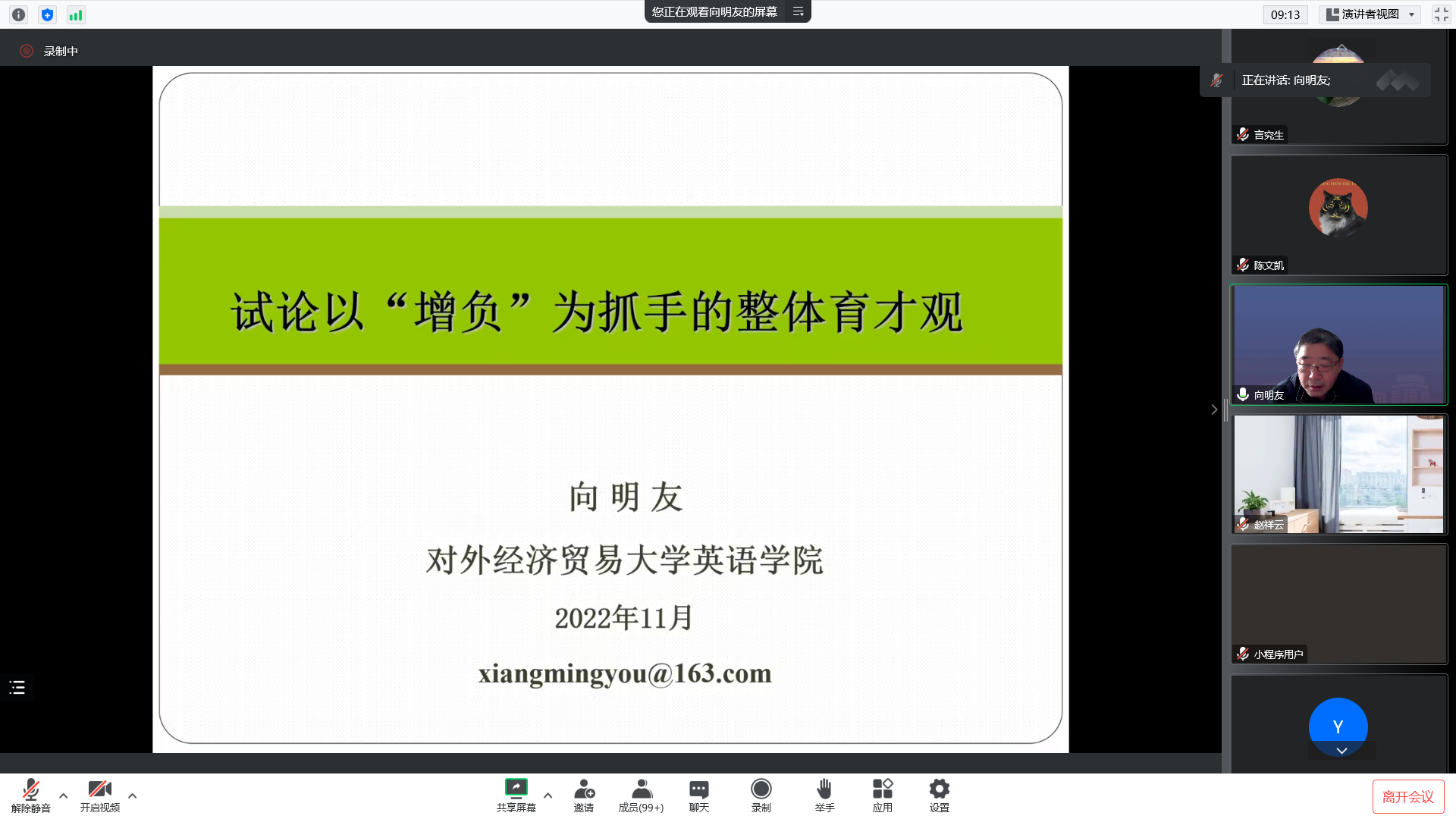 11月10日下午,我院邀请对外经济贸易大学英语体育吧 院长向明友教授做了题为“试论以‘增负’为抓手的整体育才观”的线上讲座。讲座由陈文凯院长主持,英语系、朝鲜语系、汉语国际教育系300余名师生参加了本次讲座。