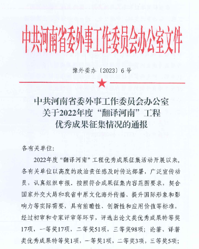 2月28日,由中共河南省委外事工作委员会办公室主办的2022年度“翻译河南”工程优秀成果征集活动(下称“活动”)评选结果公布。我院师生有四项成果获得论文类成果二等奖,为我校争得了荣誉。奖项分别是硕士研究生导师陈文凯教授指导的《河南非物质文化遗产外译与传播现状调查研究——以禹州钧瓷为例》、硕士研究生导师赵祥云老师的论文《豫菜文化对外翻译研究:原则、策略与案例》,以及边铀铀副教授指导的2020级研究生张晓阳的《殷墟博物馆解说词的韩语翻译问题与对策研究》和闫朝晖副教授指导的2020级研究生周怡良的《豫酒文化外译策略研究》等。