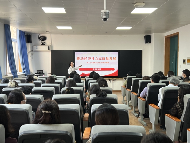 报告会上,马老师以“推动经济社会高质量发展——深入学习贯彻2024年全国两会精神”为题,从“2024年全国两会的中心任务和基本情况”“习近平总书记在全国两会上重要讲话精神的精髓要义”“2024年政府工作报告的工作部署”三方面,介绍了2024年全国两会的历史地位与重大意义。从“大力推进现代化产业体系建设,加快发展新质生产力”“深入实施科教兴国战略,强化高质量发展的基础支撑”“着力扩大国内需求,推动经济实现良性循环”“坚定不移深化改革,增强发展内生动力”等十方面重点解读了2024年政府工作任务。同时,马老师还带领与会师生系统深入地学习了“文化新质生产力”,她就新质生产力的内涵、提出过程以及如何创造新质生产力做了分享。最后,马老师还介绍了学校第五次党代会的召开情况,带领大家学习了第五次党代会工作报告,深刻分析了报告的主要内容和精神要义。马老师的宣讲精准深刻、条理清晰、深入浅出、论述生动,现场师生收获颇丰。