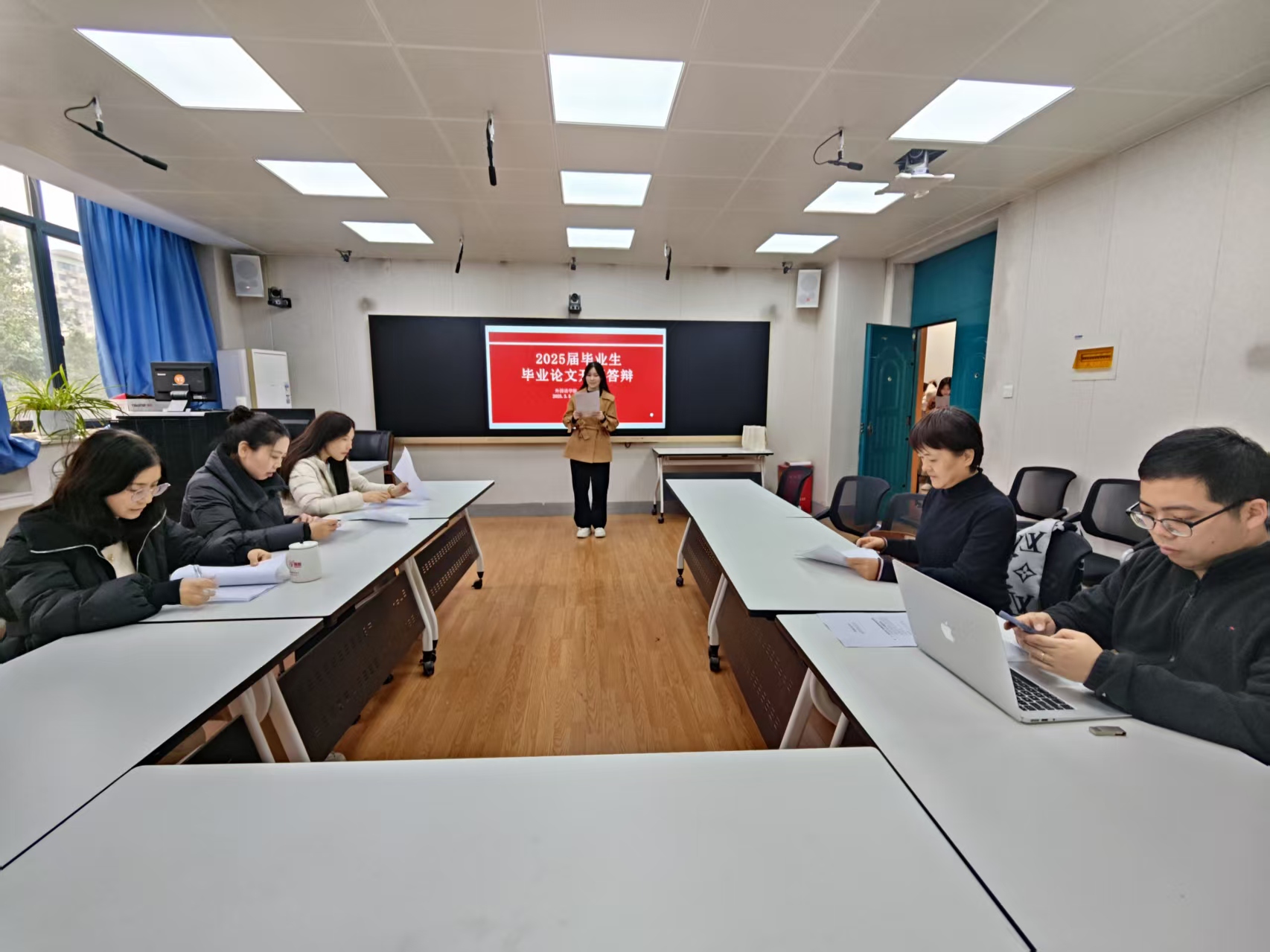 参加答辩的学生详细阐述了选题背景、研究目的、研究方法及预期成果等。答辩评委教师认真聆听了学生们的汇报,并从研究内容、研究方法、逻辑结构、文献引用等方面提出了专业且细致的意见和建议。老师们的点评既肯定了学生的努力与创新之处,也明确指出了存在的问题与不足,为他们下一步进行论文撰写提供了清晰的方向。