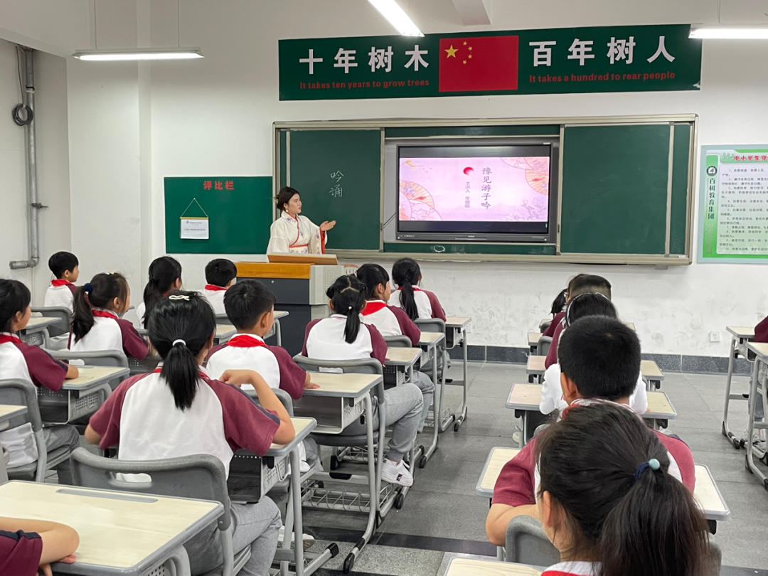 大学生吟诵社成员在江西省景德镇百树学校为孩子们讲解吟诵