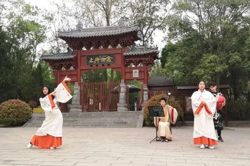 大学生吟诵社成员在嵩阳书院参与“友来友往 轻读春天”主题户外读书会展演